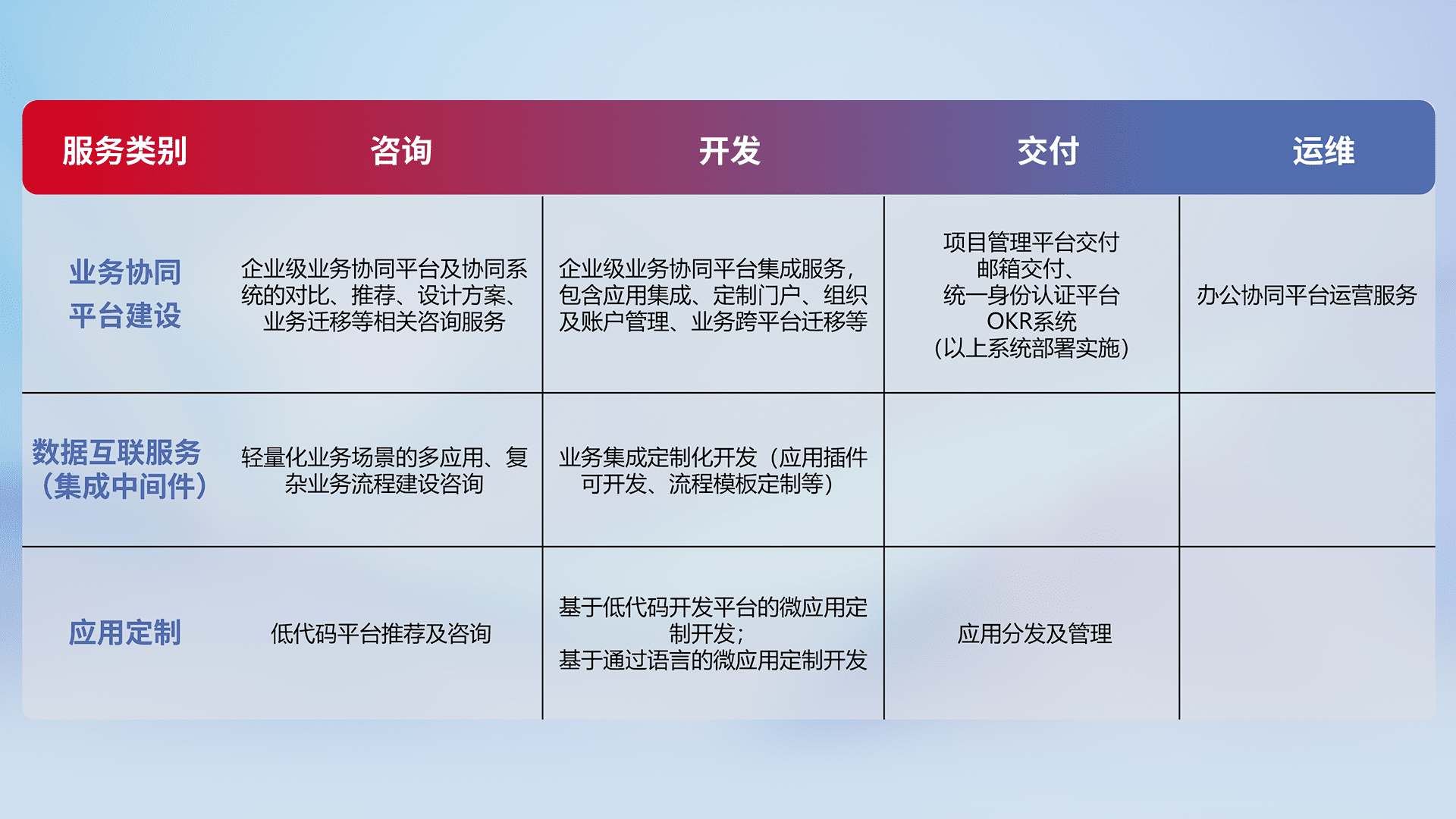 针对钉钉、、、、企微、、IDaas等平台级产品提供产品的规划、、、方案、、交付、、、、定制化开发等服务,,,实现如统一协同办公、、智能客户服务、、、混合会议管理、、、智能数据查询、、、等业务场景,,,,实现数字化转型。。。。