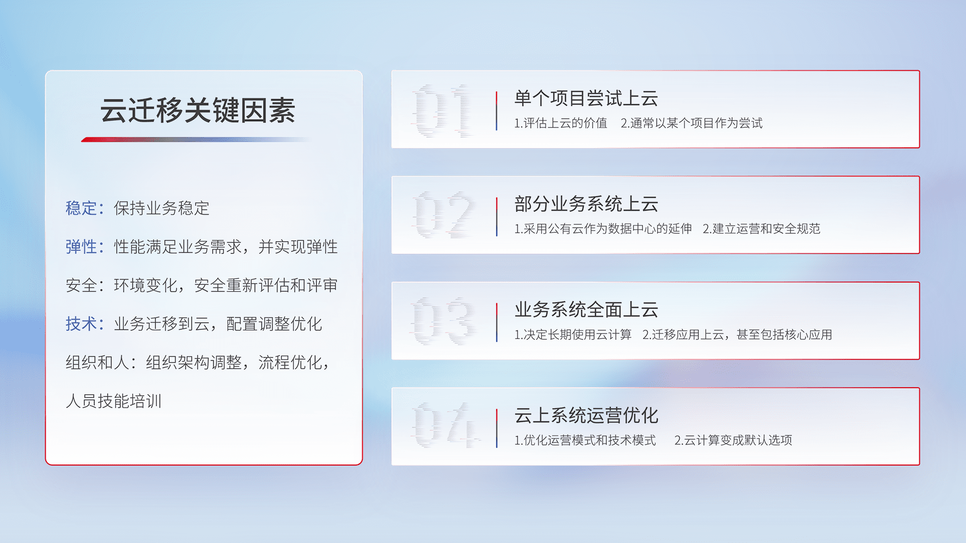 结合实际业务,,,从规划设计、、、云平台选型、、、云原生改造、、数据迁移、、集成交付,,,,迁移全过程为客户识别最佳上云路径,,,,做好风险识别管理,,,,设计网络架构、、、、身份权限、、安全审计合规、、、、操作审计、、日志审计、、、、监控告警策略、、、、多站点容灾设计等,,对云上基础设施进行整体规划,,,提升IT治理水平,,,以满足弹性、、、高可用、、高性能的需求。。。